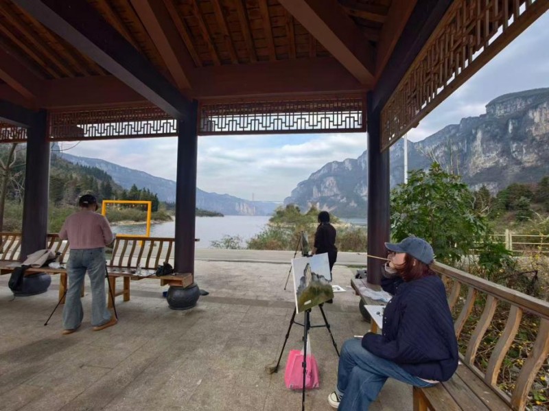 在化屋村,师生们深入“悬崖下的村寨”,以多元绘画语言描绘乌江与鸭池河大桥的壮美风光,将绿水青山、村寨新貌凝于笔端,用艺术作品展现新时代乡村的蓬勃气象。在柳岸水乡,正值当地油菜花乡村旅游季,万亩花海与“牛马场市集”民俗场景相映成趣。师生们穿行花间,聚焦民俗风情与田园生机,把乡土文化、乡村振兴成果转化为生动的艺术表达。